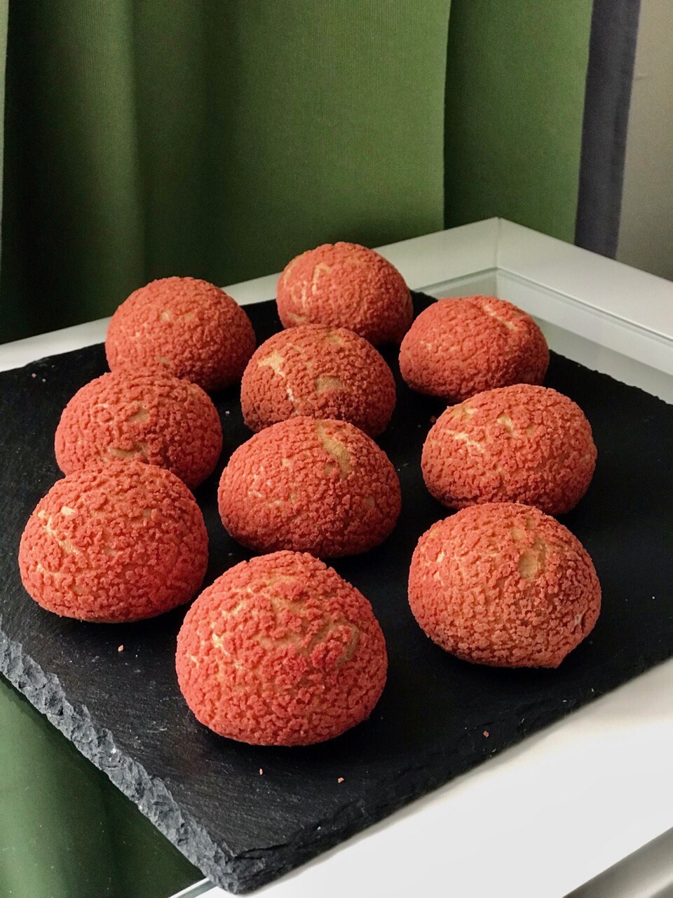 3 классических с намелакой, заварным кремом и малиной, 3 шоколадных с заварным кремом, вишней и манго, закусочный со специями, прослойкой кремчиз, зеленью и лососем