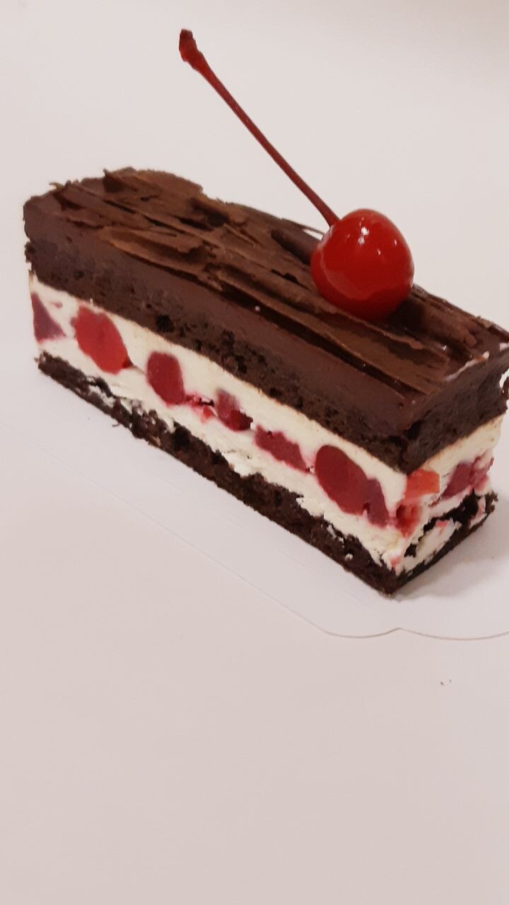 Шоколадный бисквит с вишневой пропиткой, компоте вишня со специями, взбитый ванильный ганаш, вишневый ганаш, шоколадный декор