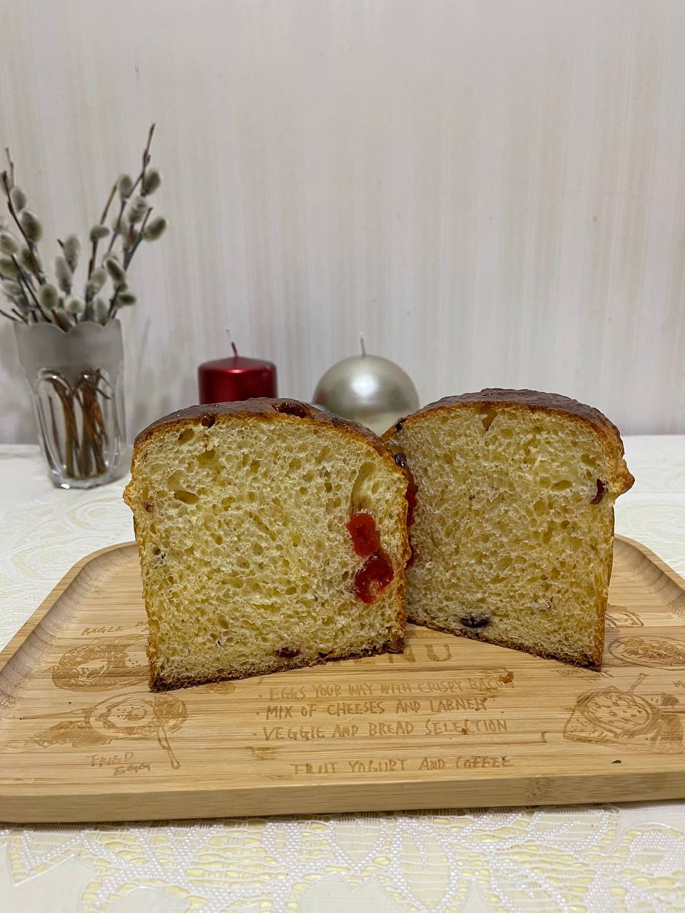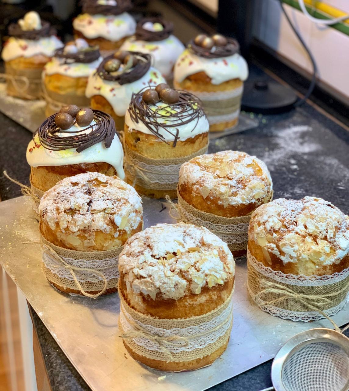 4 вида традиционной выпечки: штоллен с миндальным марципаном, куглоф с миндальными лепестками и апельсиновыми цукатами, ромовая баба с начинкой из конфитюра мандарин-кардамон, слоеная бриошь с нежным ореховым кремом