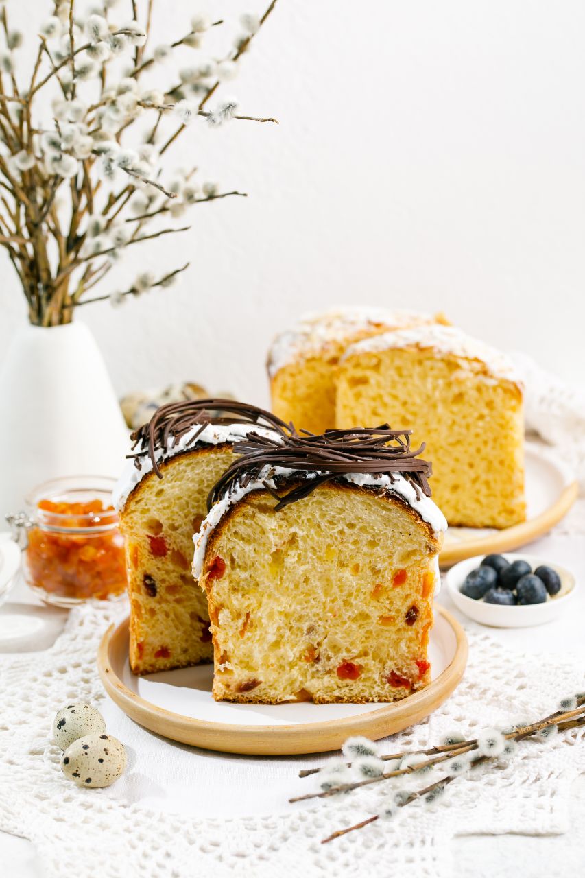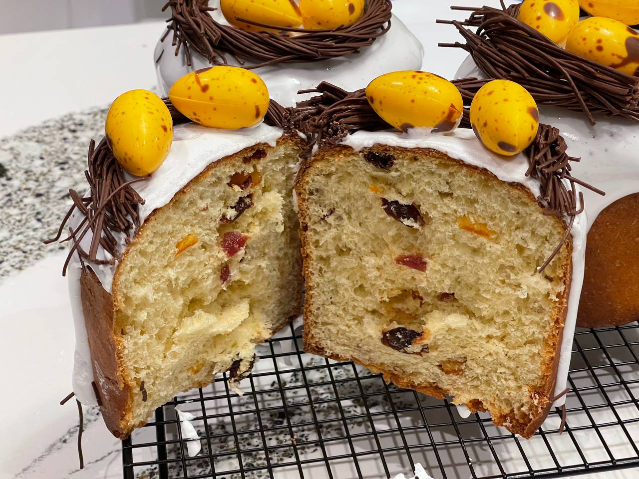2 кулича: «Заварной» с ванилью, с нежным тающим мякишем под хрустящей миндальной корочкой и «Царский» с цукатами, вишней, клюквой и специями под белой глазурью с шоколадными яйцами. Все куличи подлежат заморозке. Бонус-урок по приготовлению воздушного сдобного пирога на белках