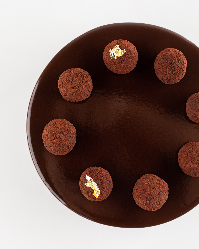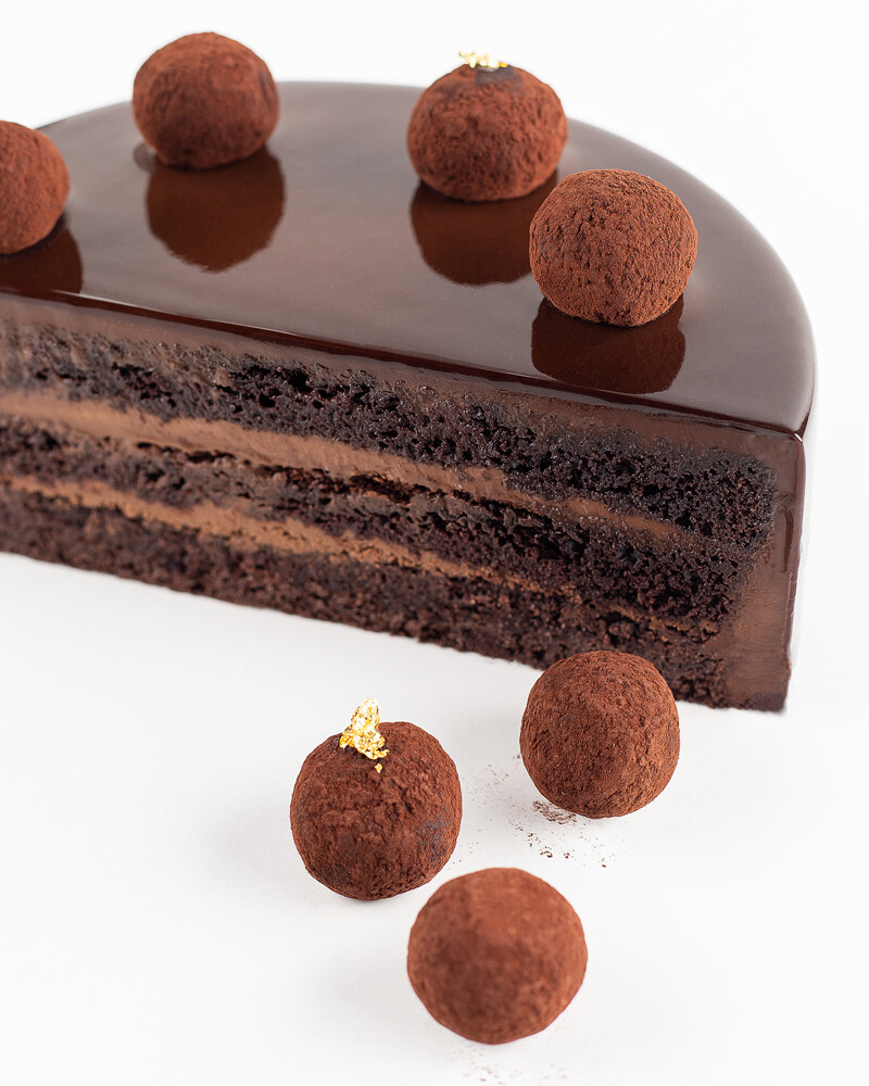 Шоколадный бисквит с пропиткой кофе, шоколадный крем-ганаш, зеркальная шоколадная глазурь, декор шоколадные трюфели