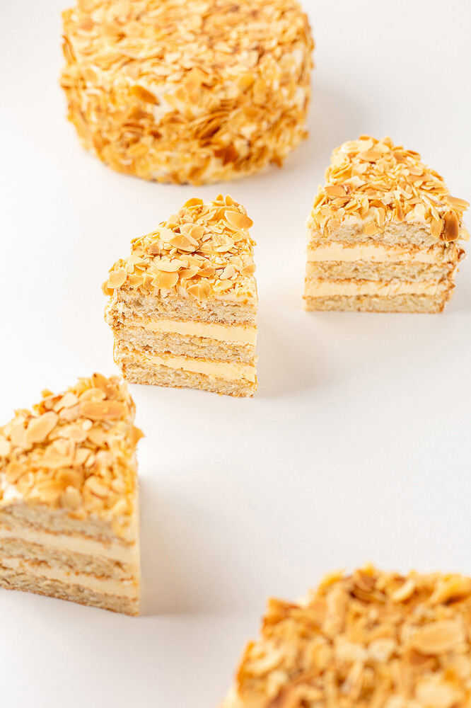 Сливочный крем с амаретто, миндальное пралине, ореховые коржи, карамелизованные лепестки миндаля