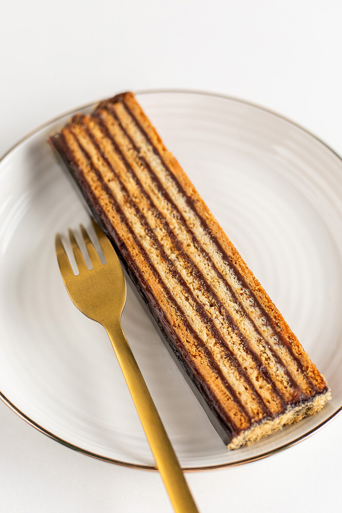 Ореховое безе, прослоенное кремом с карамелизованным орехом в хрустящей корочке и в муссе шоколад — специи