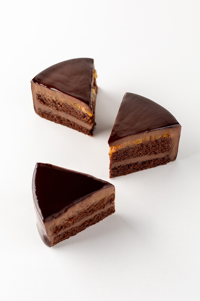 Шоколадный бисквит , начинка абрикос с апельсином, шоколадное креме, запеченный шоколадный крем-мусс