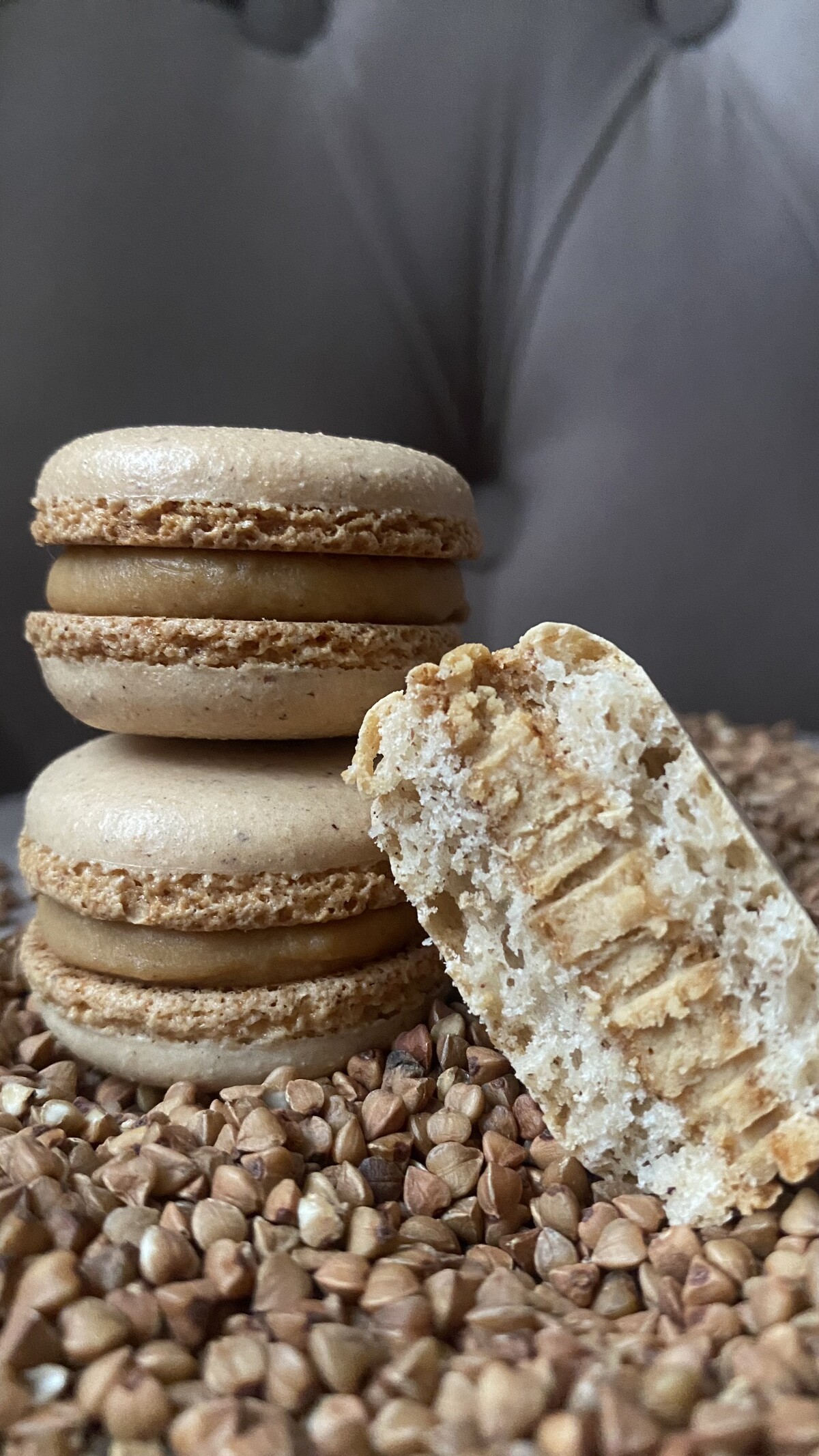 Карамельный ганаш на основе ряженки и карамелизованной гречки, миндальный макаронад с фундуком