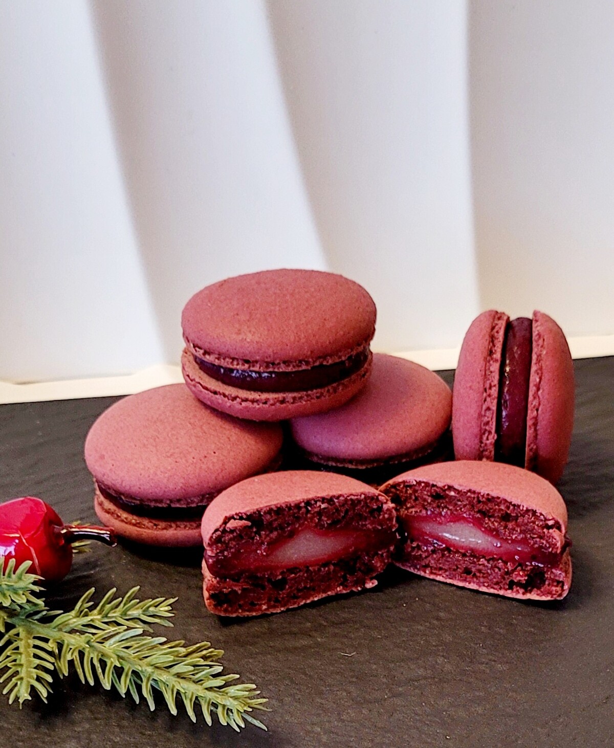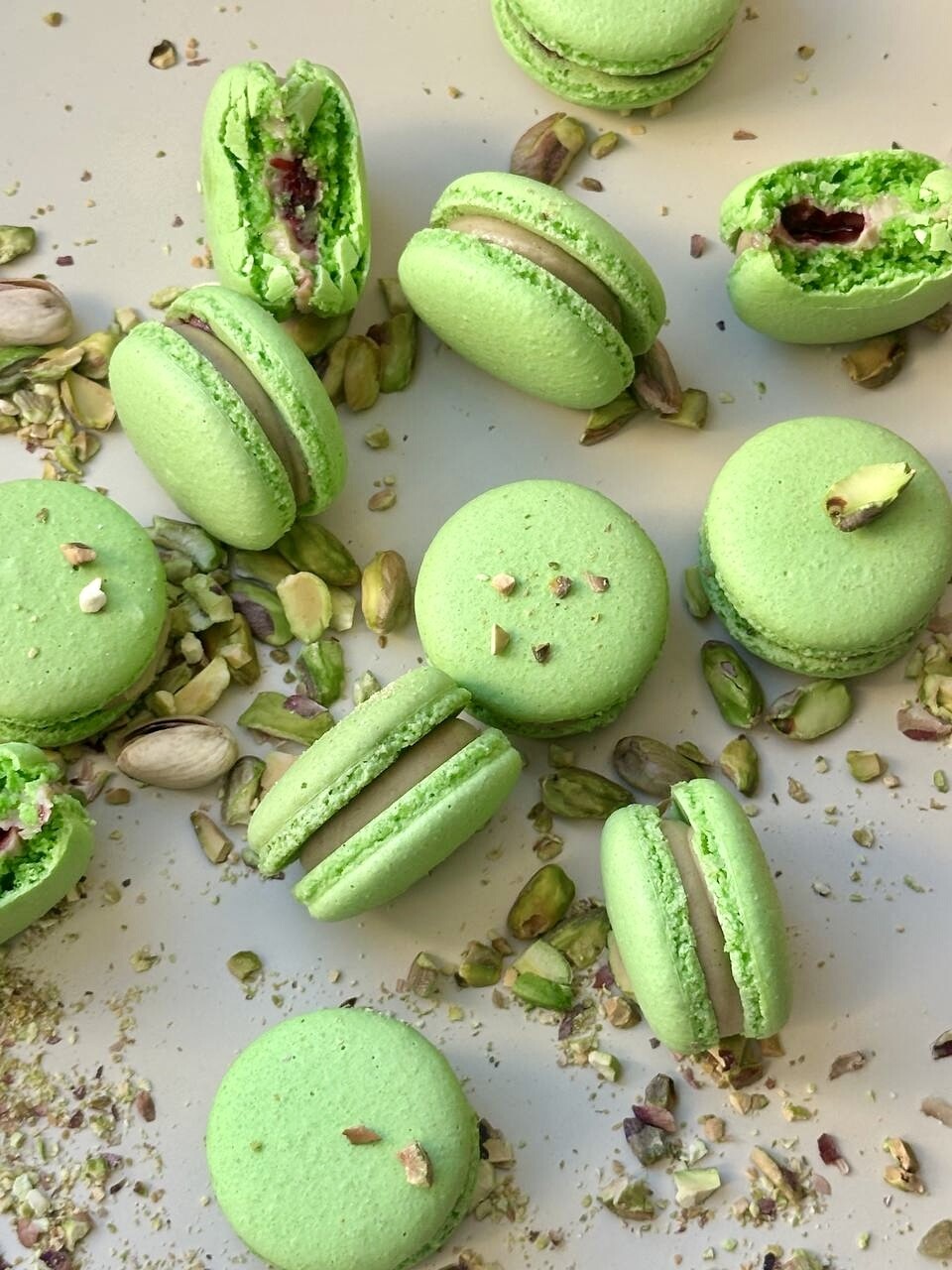 Ганаш фисташковый, карамелизованные ягоды вишни, миндальный макаронад