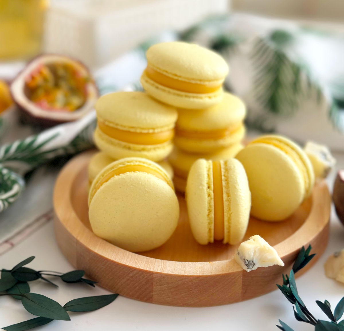 Ганаш маракуйя, центр из крема на основе сыра горгонзолла, миндальный макаронад