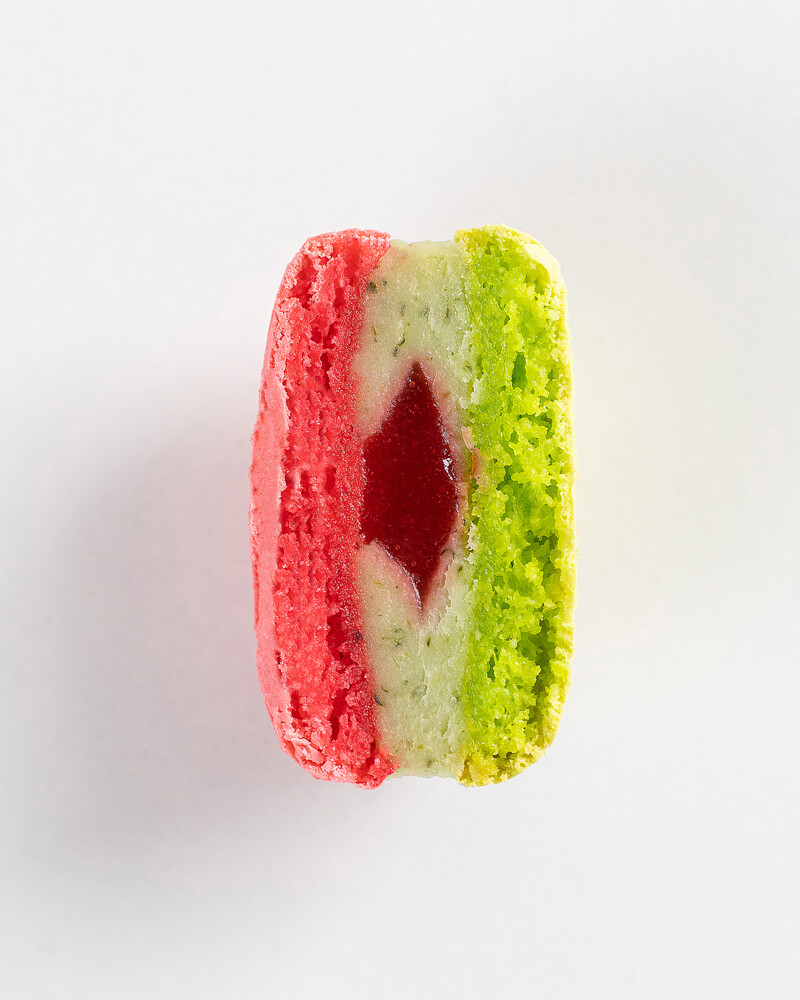 Ганаш лайм-базилик, кули клубника, миндальный макаронад