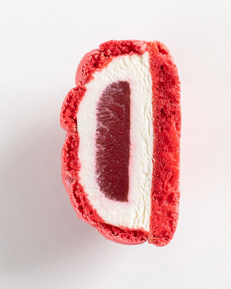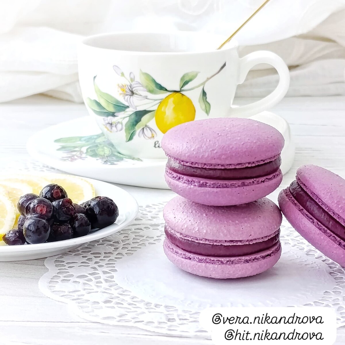 Крышечки макарон, взбитый ганаш на марципане, начинка вишня-личи