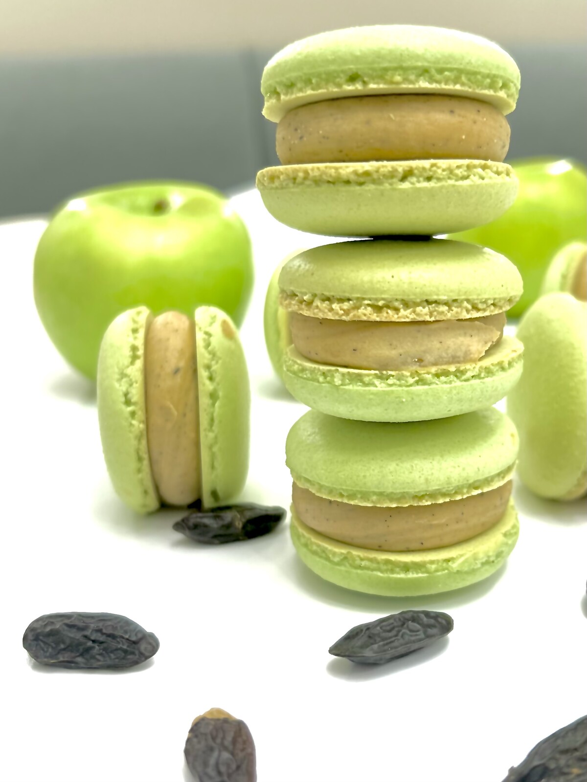 Ганаш на пюре печеного яблока с копченой ванилью и бобами тонка, гель из пюре свежего яблока, миндальный макаронад