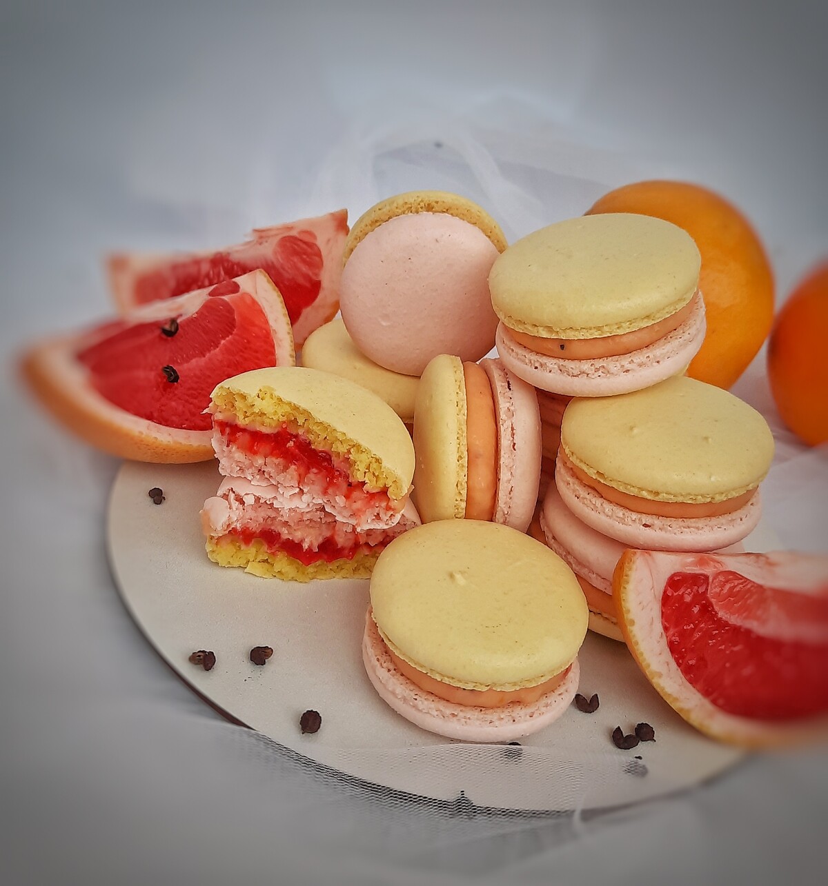 Ганаш грейпфрут, кули клубника, миндальный макаронад